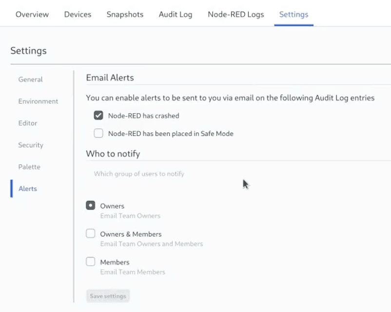 • The newly introduced feature offers email notifications tied to particular Audit log events, available to all users with Pro Tier access or higher. This feature is designed to facilitate immediate notification and action in response to Node-RED Instance crashes. For detailed information and guidance on this functionality, please refer to our documentation.