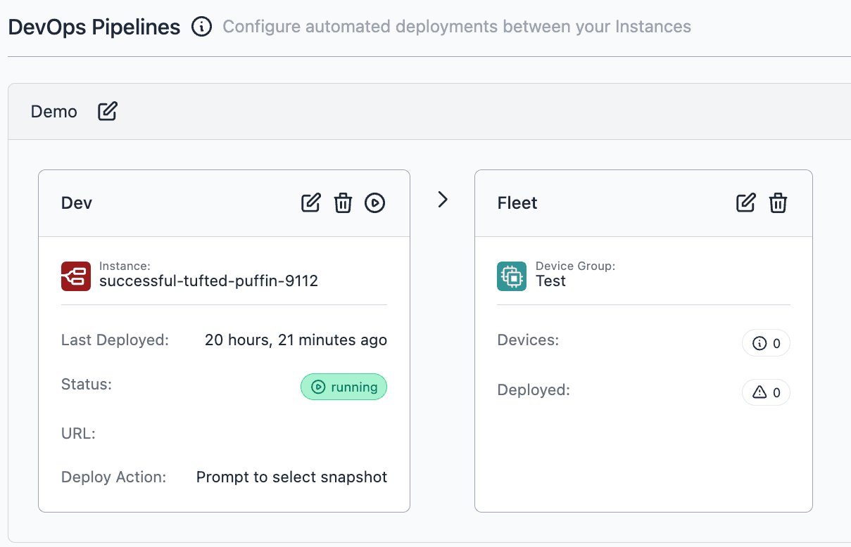 • Building on our previous release that enabled the management of devices independently of instances. Now, the integration of individual devices into DevOps Pipelines is possible. This update marks a significant step towards more flexible and efficient device management within FlowFuse. In our ongoing efforts, we are also developing features to group devices, aiming to streamline and improve the overall device management experience.